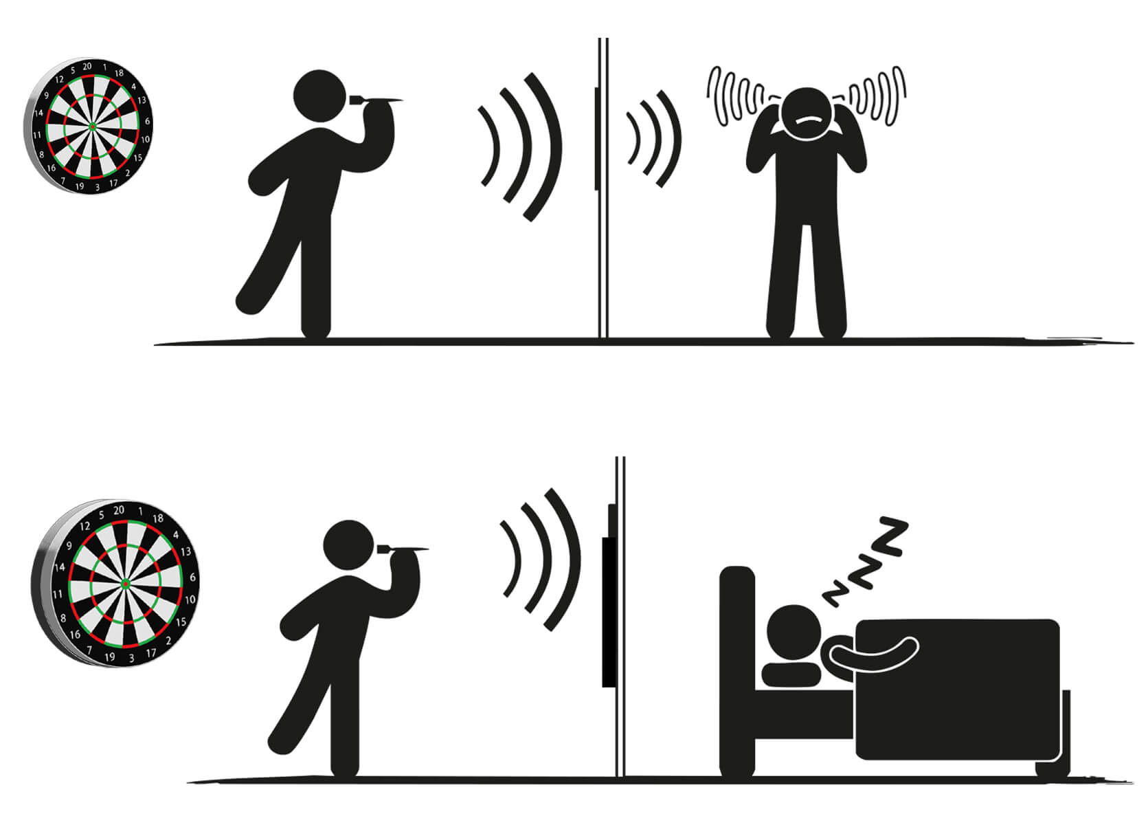 gelingt eine nahezu vollständige Geräusch Entkopplung. Beim Auftreffen des Dartpfeiles wird das dumpfe Klopfgeräusch
