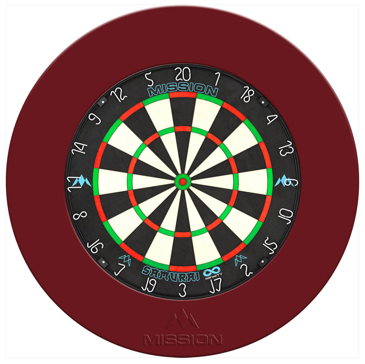 Der Dartboard Surround mit dem Mission Logo verfügt über ein Ton in Ton Finish.