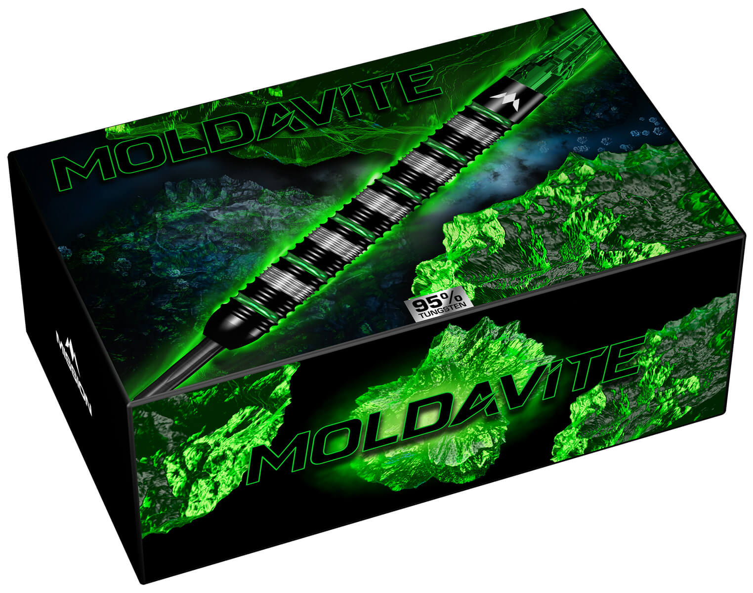 Die Mission Moldavite Darts werden in einer Präsentationsbox geliefert, die außerdem zwei zusätzliche