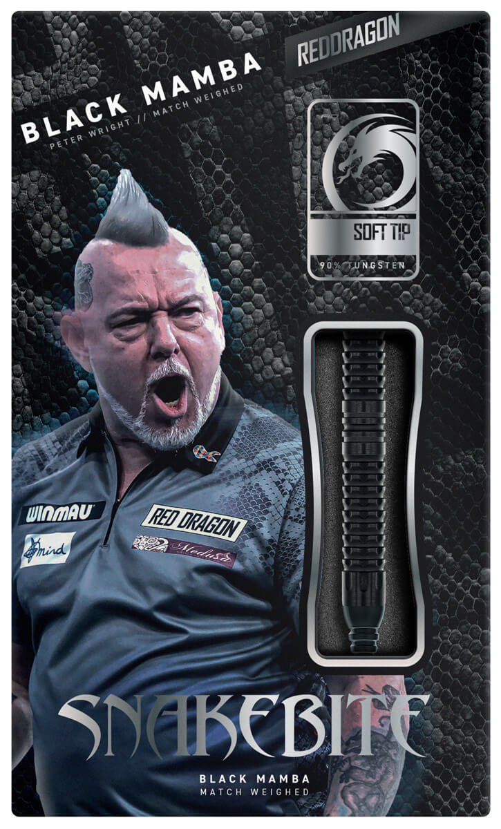 Wirf wie Snakebite mit den Peter Wright Black Mamba Softdarts. Gefertigt aus 90 % Tungsten