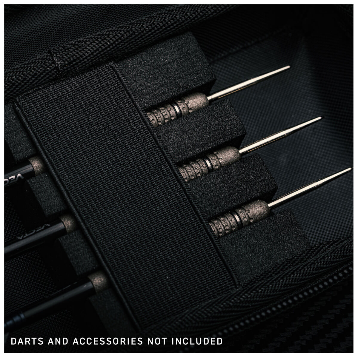 schwarzen Gehäuses. Es fasst ein komplettes Dartset und verfügt über separate