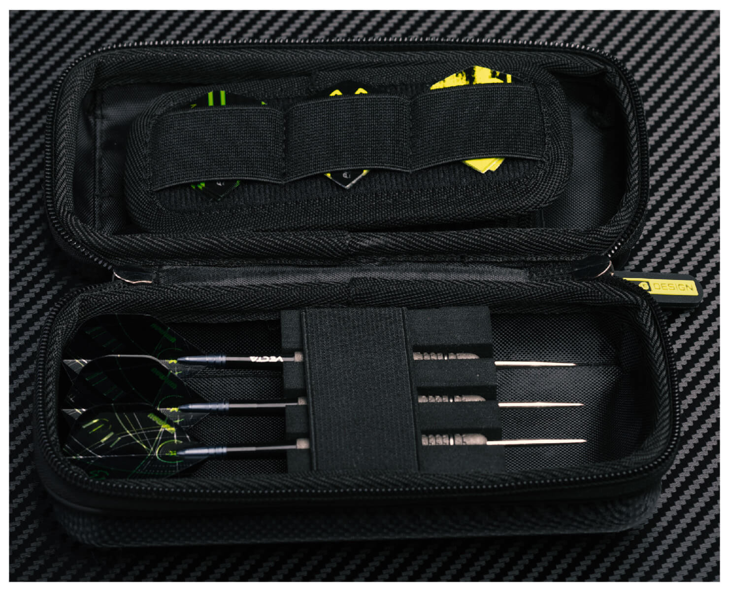 Es bietet Platz für ein komplettes Dartset sowie fünf separate Fächer für Flights und neun